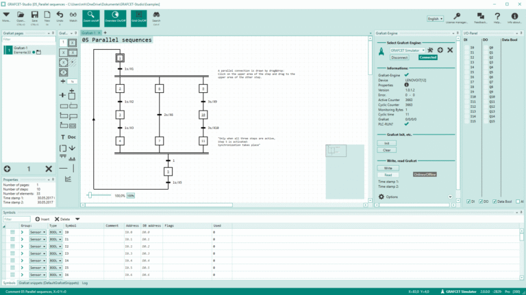 With Grafcet-Studio you can create Grafcet charts according to DIN EN 60848 and simulate them on the PC. Grafcet-Studio is the 1st software which can download the Grafcet logic across devices at the push of a button. The Grafcet logic is then executed autarkic in the device.