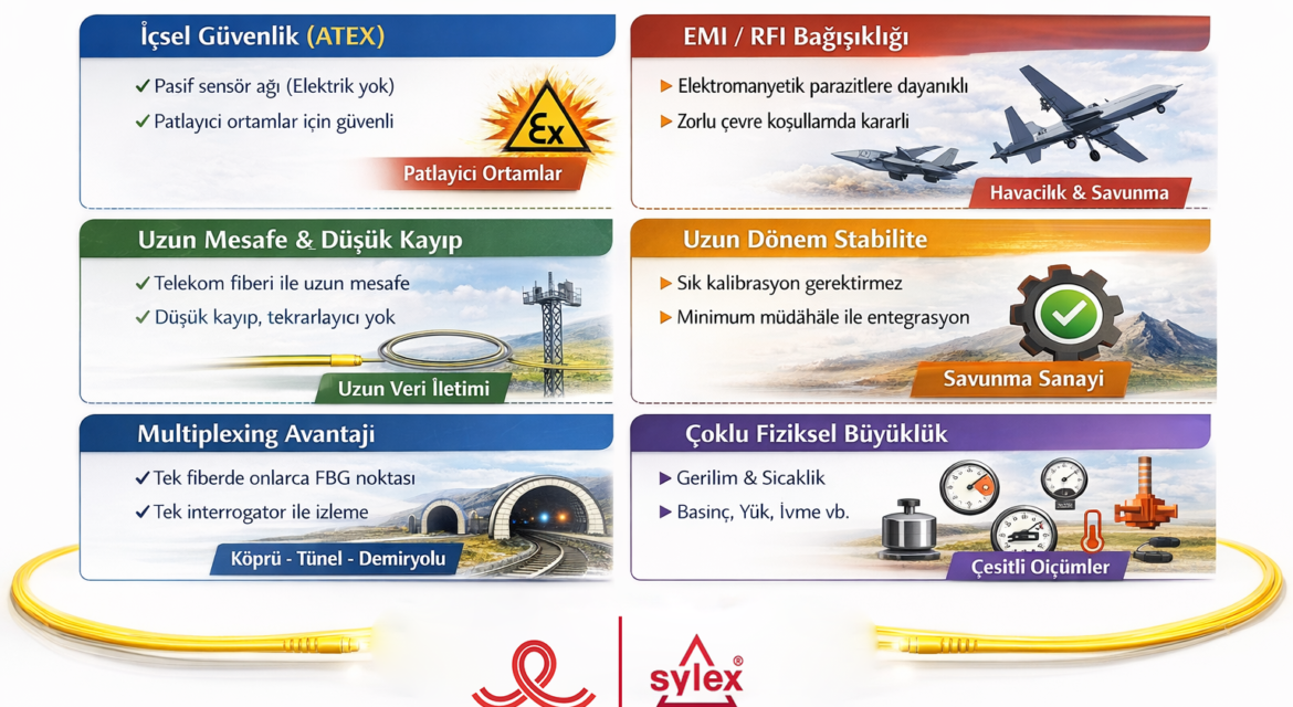 Fiber optik sensörler, klasik elektriksel sensörlere kıyasla çok daha güvenli, kararlı ve uzun mesafeli ölçüm imkânı sunan yapı sağlığı izleme (SHM) ve endüstriyel izleme çözümleridir. Fiber optik hat, hem sinyal taşıyıcı hem de sensör elemanı olarak kullanıldığı için; patlayıcı ortamlar, güçlü elektromanyetik alanlar ve zorlu çevre koşullarında güvenilir ve uzun
